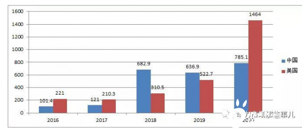 在能源革命的征程上,中國在很多新生業態的發展商都是領先“燈塔國”的。比如可再生能源發電,除了光熱、地熱、沼氣等幾個“冷門項目”,美國的裝機規模只能望中國項背,且距離越來越大。但是在電化學儲能領域,情況卻不是如此,下圖為最近5年,中美兩國儲能新增裝機對比(單位為MW)[3]: