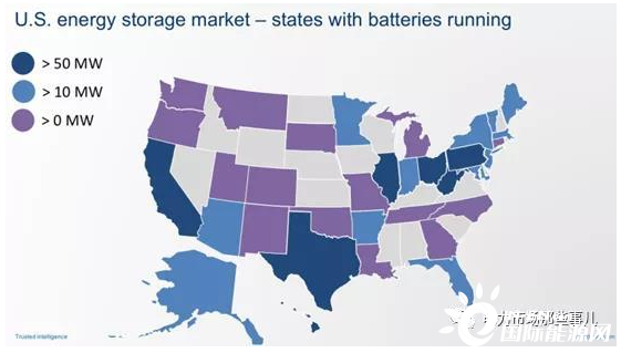 再看美國,其市場設計中包含對儲能所提供的價值的衡量機制,以及對應的交易品種,比如CAISO的靈活爬坡產品FRP、PJM的RegD調頻產品等。這些產品基于目的導向、問題導向,采用技術中性原則進行設計,盡管并不是專門服務于儲能,但卻為其發展提供了有效的保障,使得投資者、建設方能夠有效回收成本并獲取收益。從實施效果看,這兩個地區也是美國儲能發展較快的地區,如下圖所示[4]: