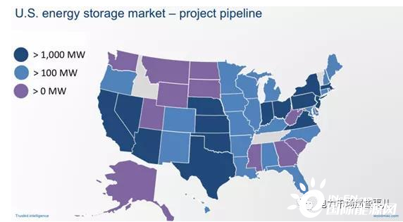 受到多重因素的影響,Wood Mackenzie預計美國儲能市場規模將在未來五年增長5倍。其中電源及電網側儲能將在2025年占到新增儲能裝機的75%到85%。下圖為各州儲能規劃示意[4]:
