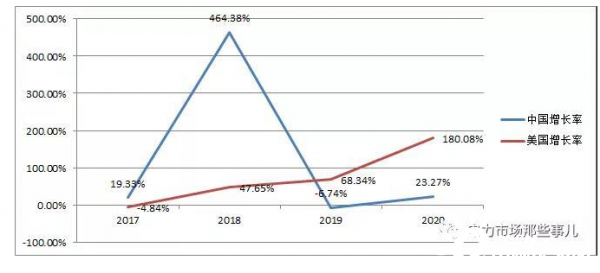 再看下中美兩國儲能新增裝機功率的增長趨勢對比: