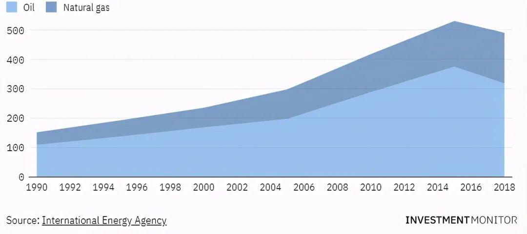 1990-2018年按來源分類的能源消費總量沙特阿拉伯的能源轉型計劃以減少、再利用、去除和循環利用碳為基礎,重點推動循環碳經濟。然而,他們并沒有承諾要減少油氣產量。