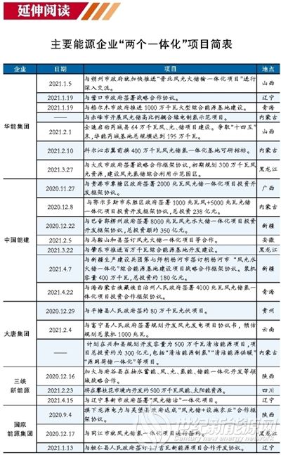另外,記者發現,華能集團、中國能建、大唐集團、三峽集團等能源央企是一體化項目投資的重要支撐,民營企業投資較少。日前,國家發展和改革委員會政研室主任、新聞發言人金賢東在新聞發布會上指出:“支持民營企業以需求為導向,積極投資建設集中式或分布式新能源、大容量儲能設施,開展‘風光水火儲一體化’‘源網荷儲一體化’示范項目建設,通過規模化商用推動關鍵技術性能大幅提升、成本顯著下降,為實現碳達峰碳中和發揮重要作用。”