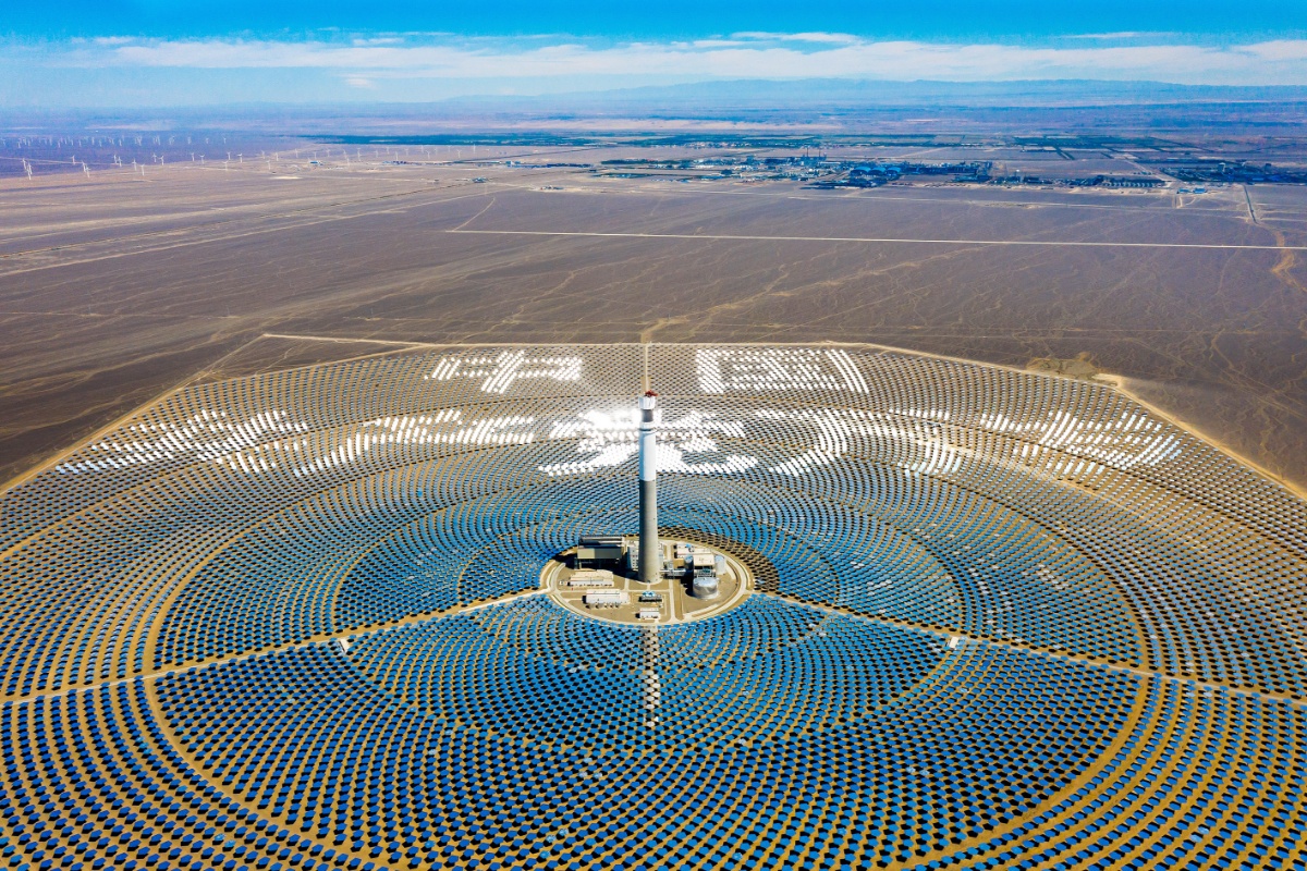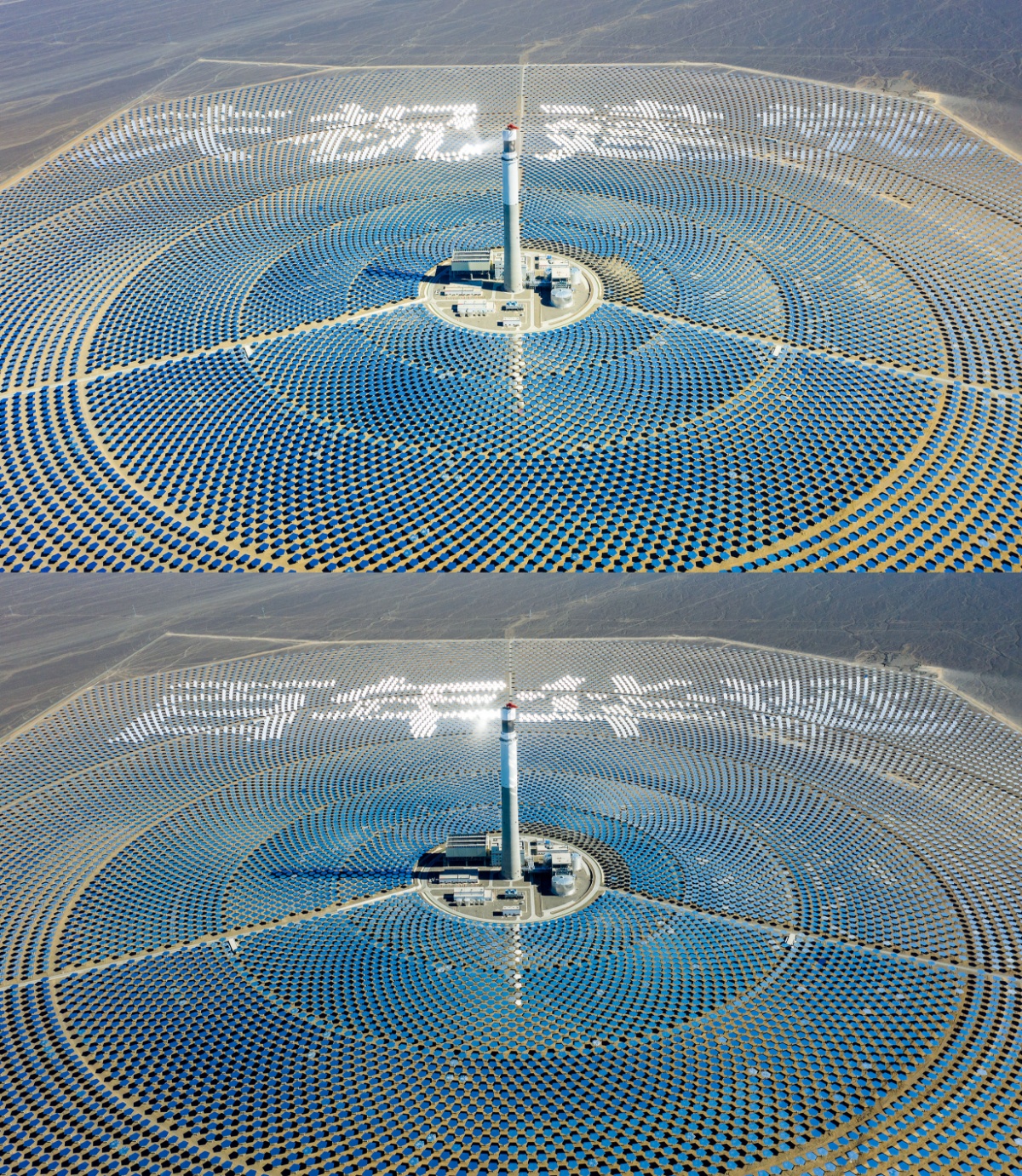 2021年6月29日,在新疆哈密市伊吾縣淖毛湖鎮光熱工業園區內的50兆瓦熔鹽塔式光熱發電站,工作人員通過智能化編程,調動定日鏡拼出“慶祝建黨百年華誕”“中國共產黨萬歲”以及黨徽等巨型文字和圖案,獻禮中國共產黨建黨100周年。