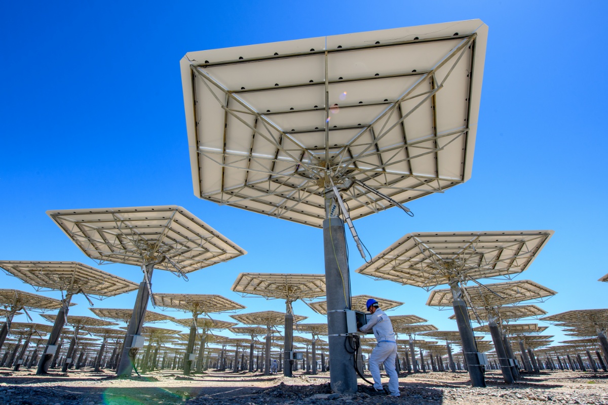 6月中旬,哈密50兆瓦熔鹽塔式光熱發電站完成地面14500面定日鏡安裝調試,進入穩定發電期。