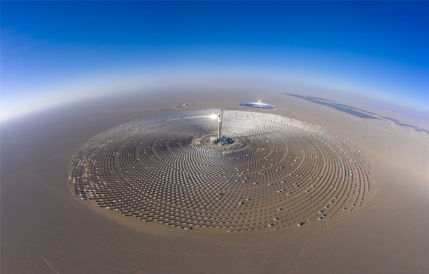 敦煌首航節能100兆瓦熔鹽塔式光熱發電項目2018年12月28日成功并網發電,是目前我國首個投運的百兆瓦級太陽能光熱示范電站,也是全球聚光面積最大、吸熱塔最高、建設周期最短的100MW級熔鹽塔式太陽能光熱電站,可實現24小時連續發電,年發電量可達3.9億千瓦時。(黃曉虎攝)