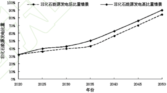 對于電力系統的低碳化程度,可以用非化石能源發電比重,即總發電量中非化石能源發電量的占比進行衡量。具體公式為:非化石能源發電比重=(非化石能源消費比重×非化石能源電能轉化比重)/一次能源電能轉化比重。考慮到非化石能源主要通過轉化為電能而得到利用,非化石能源用于發電的比重變化不會太大。因此,非化石能源發電比重的變化將主要取決于非化石能源消費比重和一次能源電能轉化比重的變化。以2020年為例,非化石能源消費比重為15.9%,一次能源電能轉化比重約為45%。與此相對應地,非化石能源發電比重為33%左右。未來非化石能源消費比重和一次能源電能轉化比重都將趨于提高,非化石能源發電比重也將隨之提高。