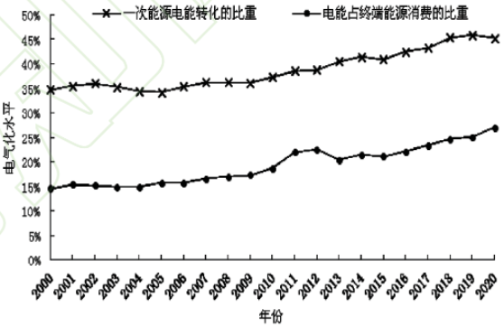 過去二十年間,隨著經濟社會快速發展、城市化進程加速和科技水平不斷進步,中國的電氣化水平穩步提升。電氣化水平在能源生產側主要體現為一次能源通過電能轉化的比重,即一次能源用于發電的比重,在消費側主要體現為電能占終端能源消費的比重。如圖1所示:在生產側,一次能源電能轉化的比重從2000年的35%左右逐步提高到2020年的45%左右;在消費側,電能占終端能源消費的比重從2000年的不到15%逐步提高到2020年的27%左右。近年來,在能源革命戰略引領下,可再生能源的發展和終端電能替代取得了較快進展,電氣化水平提升較快。