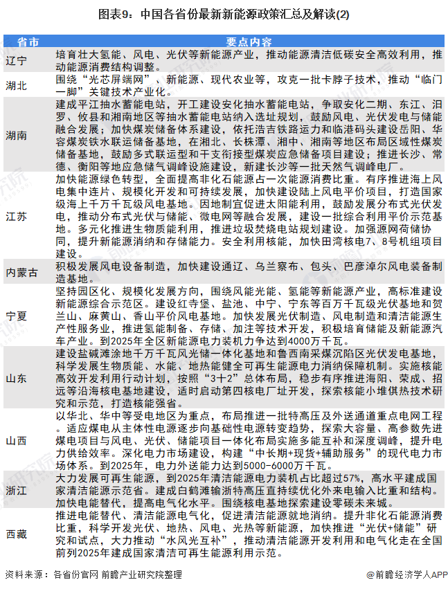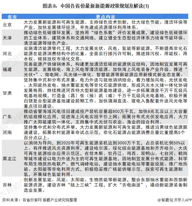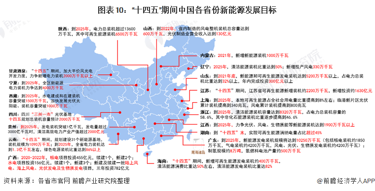 截止2021年7月中旬,全國各省、市、自治區已基本出臺當地第十四個五年規劃和二〇三五年遠景目標綱要。據統計,北京市、福建省、甘肅省、廣東省、河南省、黑龍江省、湖南省、江蘇省、內蒙古自治區、寧夏回族自治區、山東省、山西省、陜西省、上海市、西藏自治區、云南省、浙江省等地區在“十四個五年規劃”中,對新能源因地制宜地發展和綠色節能減排有不同的規劃: