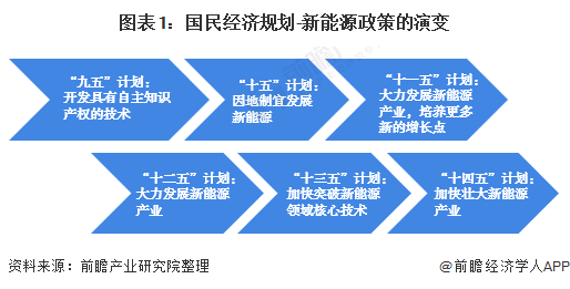 “九五”計劃(1996-2000年)時期,國家層面提倡開發具有自主知識產權的技術;“十五”計劃(2001-2005年)時期,國家層面提倡因地制宜發展新能源;“十一五”規劃(2006-2010年)至“十二五”規劃(2011-2015年)時期,規劃明確了要大力發展新能源產業;“十三五”規劃(2016-2020年)時期明確了加快突破新能源領域核心技術的發展方針。到“十四五”時期,根據《“十四五”規劃和2035年遠景目標剛要》,加快壯大新能源產業成為新的發展方向。