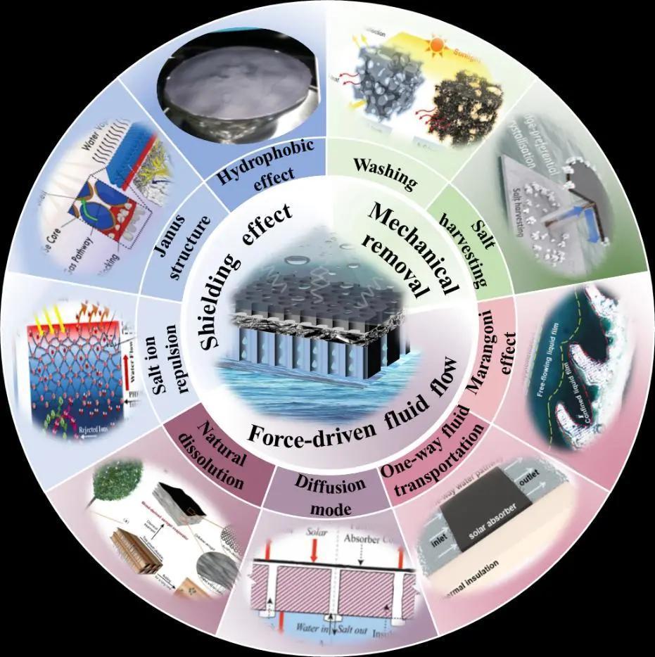 進一步綜述了現有蒸發系統的全部阻鹽策略,分為人工移除(包括清洗、收集)、屏蔽效應(包括疏水效應、雙面膜、離子排斥)、勢場液流驅動(包括夜間自溶解、反向自擴散、單向液流、馬蘭戈尼效應)(圖2),分析了各種阻鹽機制的優缺點,展望了該領域的挑戰和機遇,最近以“Recent AdvancedSelf-Propelling Salt-Blocking Technologies forPassive Solar-DrivenInterfacial Evaporation Desalination Systems”為題發表在國際能源領域權威期刊Nano Energy(影響因子為17.881)上。該工作有望為設計和開發高效耐鹽太陽能海水淡化系統提供借鑒意義。