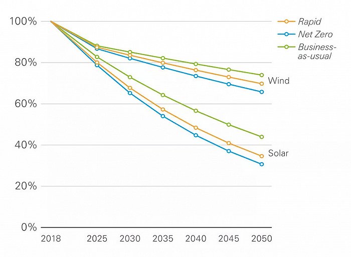 未來30年光伏成本下降曲線,資料來源:BP Energy