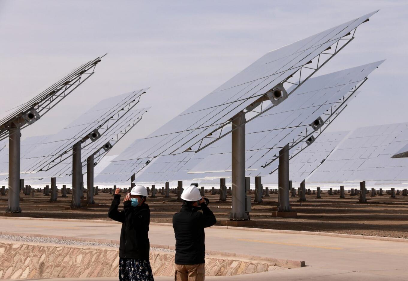 2021年10月11日,參觀者在甘肅省敦煌市光電產業園區首航節能100兆瓦塔式熔鹽光熱發電站參觀。