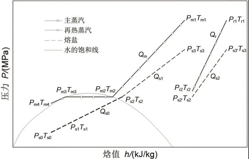 由圖2和熱質平衡方程可知,儲熱換熱過程中,受限于熔鹽凝固溫度,主蒸汽和再熱蒸汽換熱后的溫度(Tm4、Tr2)不能低于凝固風險溫度,主蒸汽和熔鹽換熱夾點溫差的上端溫度(Tm2)取決于主蒸汽壓力(pm2),熔鹽儲熱過程的熱熔鹽溫度(Ts3)取決于主蒸汽和再熱蒸汽的最高溫度(Tm1、Tr1)和熔鹽流量(Qs1、Qs2)。