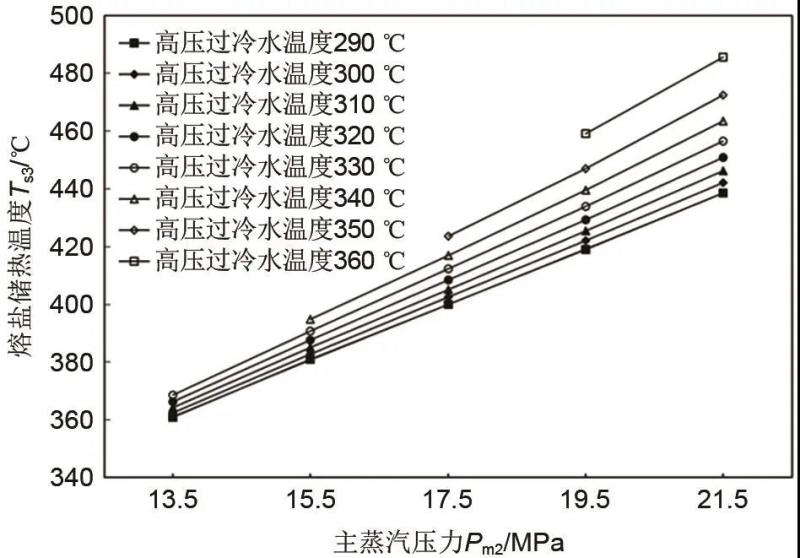 熔鹽儲熱過程熔鹽流量(Qs0)和熱熔鹽溫度(Ts3)隨過冷高壓水溫度(Tm4)的變化關系分別如圖5和圖6所示。由圖知,在相同主蒸汽壓力(pm2)條件下,熔鹽流量(Qs0)隨過冷高壓水溫度(Tm4)的增加近似呈線型減小的關系,熔鹽儲熱過程熱熔鹽溫度(Ts3)隨過冷高壓水的溫度(Tm4)增加呈加速增大的關系。由于過冷高壓水溫度(Tm4)的增大,其與凝結放熱溫差越小,在過冷換熱段釋放出更少的熱量,有助于減少在過冷加熱段的熔鹽流量(Qs0)。與此同時,熔鹽充熱熱量將被更高溫度的凝結換熱段和過熱換熱段占據更高比例,故熔鹽儲熱過程熱熔鹽溫度(Ts3)會逐漸增大。所以,儲熱系統設計較高的過冷高壓水溫度(Tm4),可提高熔鹽儲熱過程熱熔鹽溫度(Ts3)和減少熔鹽流量(Qs0)。