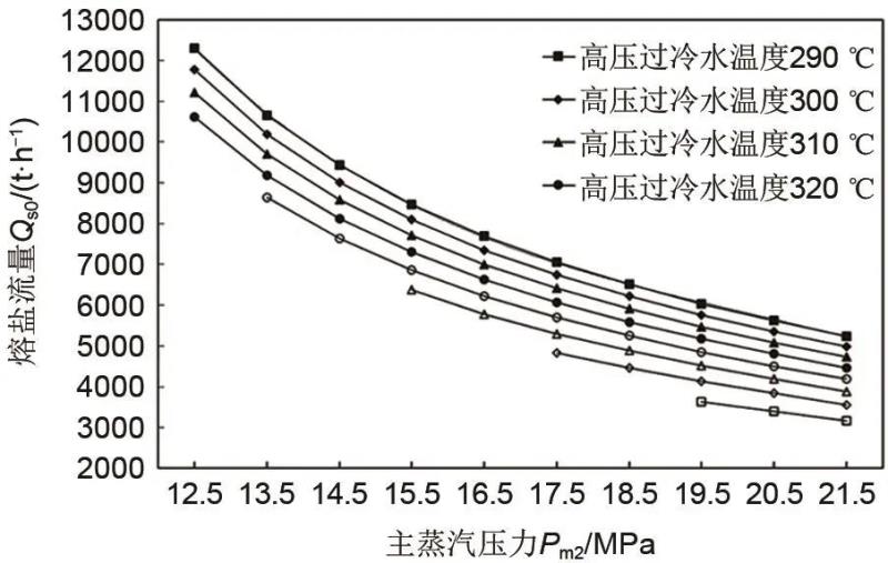 熔鹽儲熱為顯熱儲熱,在充熱功率和充熱時長確定的條件下,熔鹽使用量取決于熔鹽流量(Qs0)和熔鹽儲熱過程溫差(?T=Ts3-Ts1)。如前所述,受限于熔鹽安全使用溫度范圍,熔鹽儲熱過程冷熔鹽溫度(Ts1)設計為280℃,夾點溫差5℃,假定主蒸汽換熱后的溫度,即過冷高壓水溫度,和再熱蒸汽換熱后的溫度相同,即Tm4=Tr2。則熔鹽儲熱過程熱熔鹽溫度(Ts3)和熔鹽流量(Qs0)隨主蒸汽壓力(pm2)的變化關系分別如圖3和圖4所示。