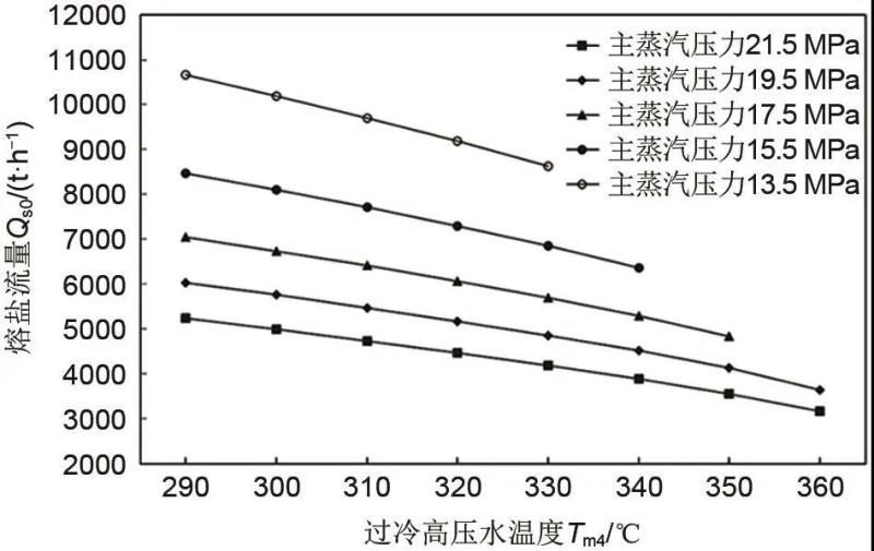 進一步分析圖5和圖6可知,最小熔鹽流量(Qs0)和最大熱熔鹽溫度(Ts3)均出現在過冷高壓水的溫度Tm4=360℃條件下,故儲熱過程理論上應盡量提高過冷高壓水的溫度(Tm4)才能降低儲熱成本,但實際上過冷高壓水的溫度過高(Tm4>360℃)會造成數個換熱器處于水的臨界點附近換熱,由于此時水的熱物性參數波動較大,導致換熱器制造困難或者成本增大。此外,較高溫度的過冷高壓水(Tm4>360℃)與主機模塊高加加熱器出口給水混合后,可能導致鍋爐省煤器入口給水接近飽和態,容易造成省煤器內給水汽化問題,影響鍋爐安全性。故本方案熔鹽儲熱過程中,過冷高壓水溫度(Tm4)宜取360℃。