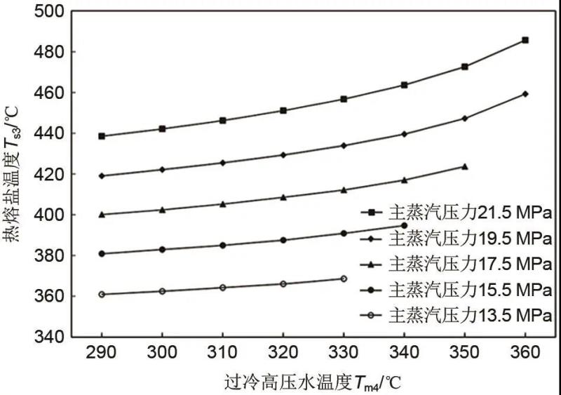 圖6熱熔鹽溫度(Ts3)隨過冷高壓水溫度(Tm4)的變化關系