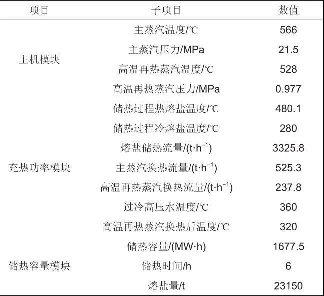 結合工程實際和前述理論分析,百兆瓦級熔鹽儲能技術選定技術參數見表1。儲熱容量指熔鹽儲能系統設計儲存熱量,由充熱功率和充熱時長決定。其中,充熱時長取火電機組供熱季常見的調峰時長6 h。充熱功率為主機模塊中鍋爐熱功率與汽輪機所需蒸汽熱功率差值,則本例充熱功率為279.6 MW。故熔鹽儲能系統設計儲熱量為1677.5 MW·h。