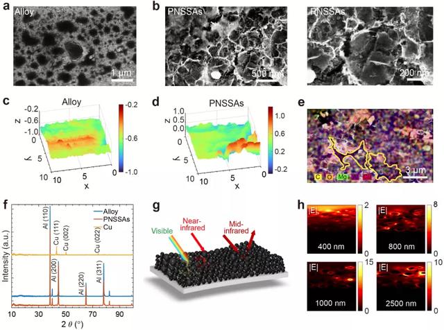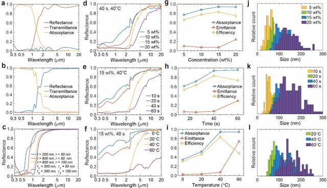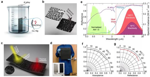 其中,圖 2g 和圖 2h,描述了太陽能吸收器的工作原理,具體來說銅的納米結構負責對太陽光進行高吸收,而銅的納米結構也具備對中紅外波段的高透性,底部鋁合金的基底則對中紅外波段具有高反射性。
