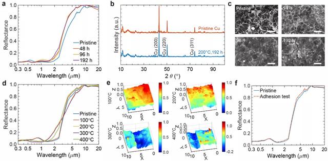 由上圖可知,高溫下的光譜穩定性,是衡量太陽能吸收器性能的重要指標。經過 192 小時和 200°C 的高溫穩定性實驗,銅納米結構的光譜穩定性、晶型和表面結構得以保持。而對瞬時高溫的不敏感性,也是設計太陽能吸收器的要點之一。