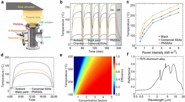 據悉,在一個標準太陽光譜(1kWm-2)的照射下,真空腔中改結構達到 165°C 的穩態溫度。在不同太陽光照和日光照射下的實驗中,也證明了該結構具有良好的光熱轉換能力。