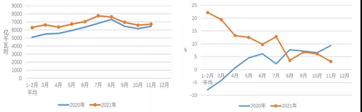 圖1 2020、2021年分月全社會用電量及其增速