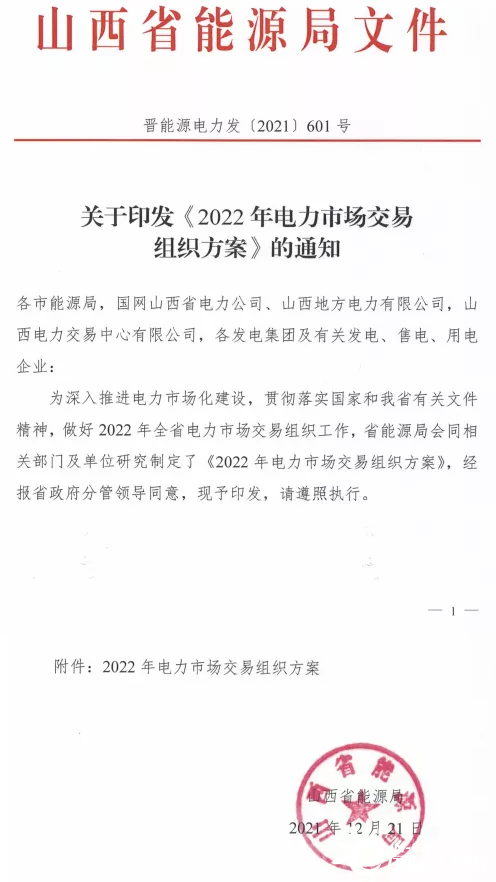12月27日,山西省能源局印發《2022年電力市場交易組織方案》。根據方案,2022年山西省省內電力市場交易規模約1500億千瓦時,較2021年增加約8%。
