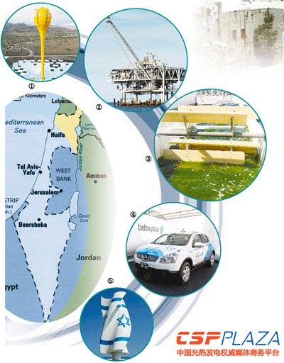 圖片說明:①Aora公司首座100千瓦模塊,由塔架及鏡陣組成。②近海天然氣鉆井平臺。③Seambiotic公司的尖端水生系統。④Better Place電動車的充電網絡。⑤Techno Spin公司的小型風力渦輪機,轉動葉片設計獨特、效率高。