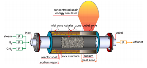 太陽能光熱驅動的蒸汽甲烷重整是實現能源脫碳、升級和利用的有效途徑,其中分布式太陽能熱化學反應器(STR)被廣泛研究。STR是實現太陽能光-熱-化學轉化的關鍵部件。然而,目前的STR存在導熱性能差和受太陽能輻照度制約的問題。團隊提出一種基于高溫熱管的管式反應器,突破目前制氫反應器技術瓶頸,實現了太陽能光熱與光伏電的混合能源供應的全時長產氫。