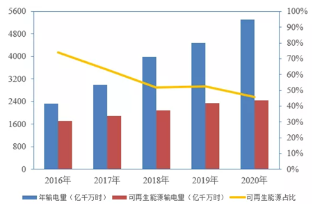“十三五”期間,我國特高壓工程建設進展迅速,特高壓線路輸送電量和輸送可再生能源電量逐年增加,“西電東送”工程穩步向前,但輸送可再生能源電量的比重反而在下降,2020年我國22條特高壓輸送通道平均可再生能源占比為46%,創下近五年新低。2021年10月24日,國務院印發的《2030年前碳達峰行動方案》提出“嚴控跨區外送可再生能源電力配套煤電規模,新建通道可再生能源電量比例原則上不低于50%。”可以預見,隨著全社會對碳達峰、碳中和目標形成共識以及國家政策引導,清潔能源占比將持續提升。