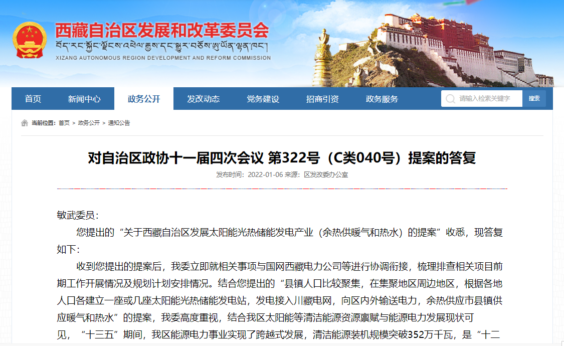 日前,西藏自治區發展和改革委員會回復了,政協委員提出的“關于西藏自治區發展太陽能光熱儲能發電產業(余熱供暖氣和熱水)的提案”回復顯示:十四五”期間,西藏自治區將積極努力爭取國家對西藏太陽能等可再生能源發電的補貼支持政策的同時,高度重視建設清潔能源接續基地和清潔可再生能源利用示范區。