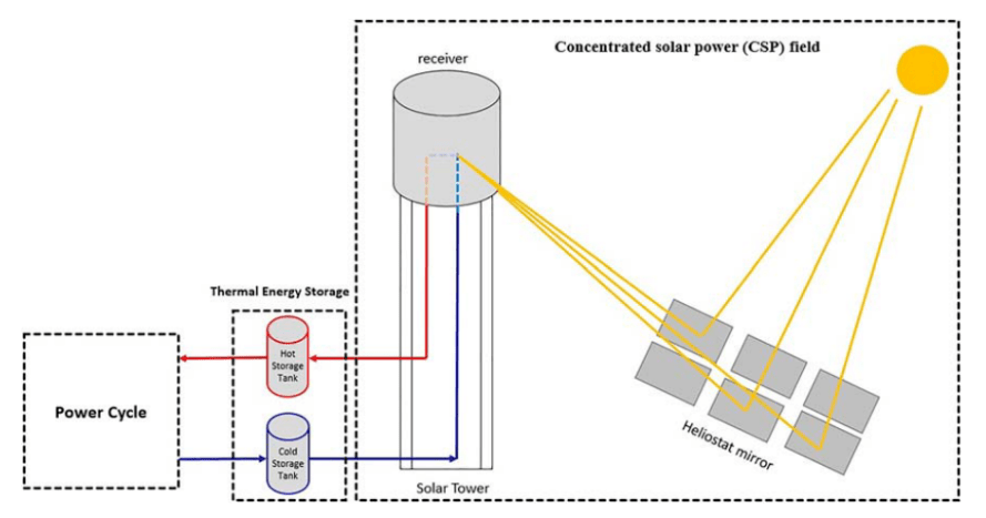 太陽能熱塔式發電系統(SPT)是一種CSP系統,因為其可以在相對較高的溫度下運行。目前的SPT—TES場由定日鏡場、太陽能塔、接收器、換熱器和兩個熔鹽TES罐組成。主要的熱經濟性指標是容量系數和平準化電力成本(LCOE)。