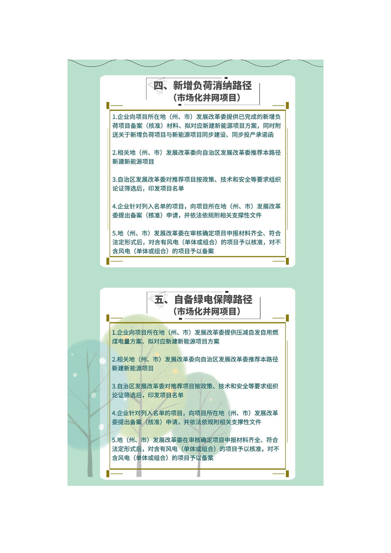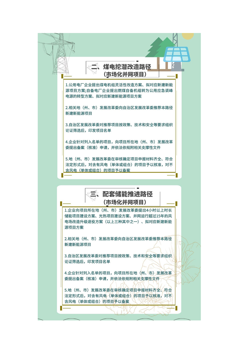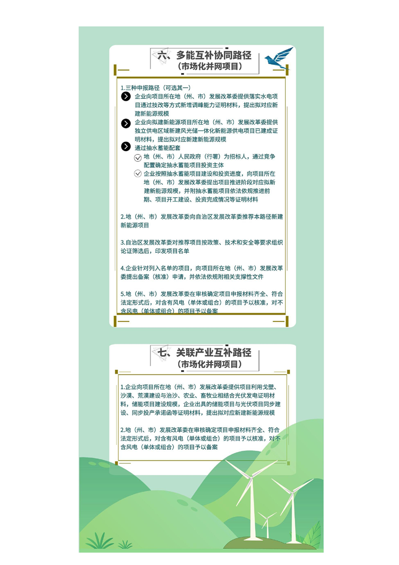 二是第(一)條路徑中項目為保障性并網項目,光伏(向大電網送電)項目由自治區發展改革委備案,風電項目由地(州、市)發展改革委核準;第(二)(三)(四)(五)(六)條路徑中項目,為通過源網荷儲一體化、多能互補等方式建設的市場化并網項目。根據《國家發展改革委國家能源局關于完善能源綠色低碳轉型體制機制和政策措施的意見》(發改能源〔2022〕206號)中“深化能源領域‘放管服’改革,優化清潔低碳能源項目核準和備案流程”精神,自治區發展改革委經組織國家能源局新疆監管辦、自治區自然資源廳、生態環保廳、國網新疆電力有限公司等相關部門和單位,按政策、技術和安全等要求論證,將符合要求的項目列入自治區項目名單后,統一由地(州、市)發展改革委核準(備案);第(七)條路徑中項目為市場化并網項目,由各地(州、市)發展改革委核準(備案)。