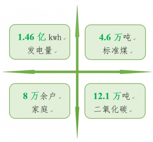項目設計年發電量1.46億kW·h,建成后可為8萬余戶家庭提供一年清潔電力,實現二氧化碳和污染物零排放,每年可節約4.6萬噸標準煤、減排二氧化碳氣體約12.1萬噸,具有良好的經濟效益與社會效益。