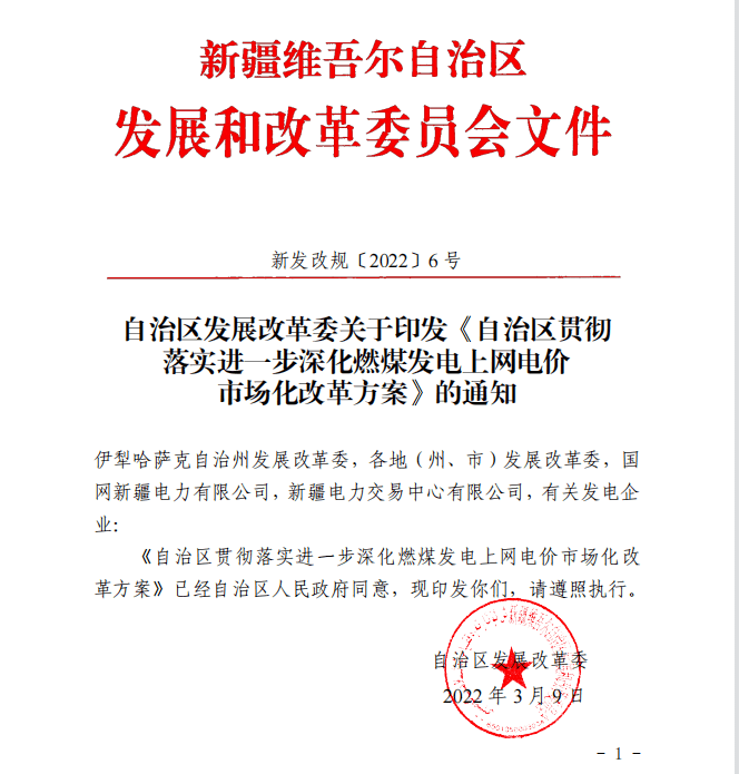 3月25日,新疆發改委網站上發布了關于印發《自治區貫徹落實進一步深化燃煤發電上網電價市場化改革方案》的通知。