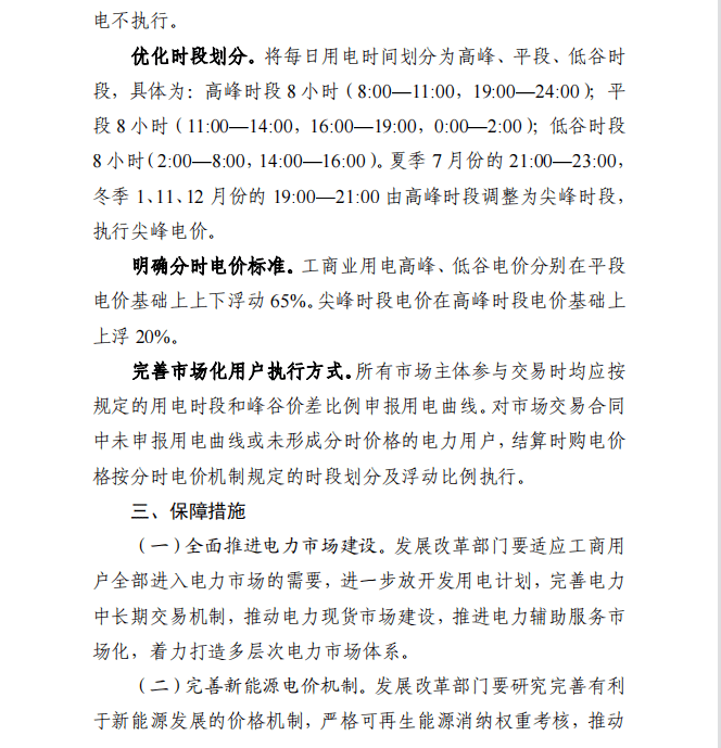 工商業用電高峰、低谷電價分別在平段電價基礎上上下浮動65%。尖峰時段電價在高峰時段電價基礎上上浮20%。