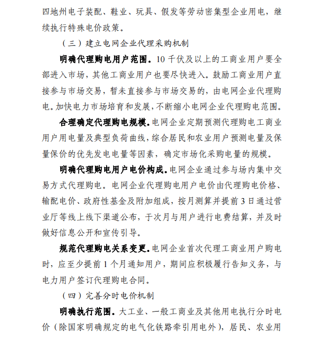 建立電網企業代理采購機制。明確代理購電用戶范圍。10千伏及以上的工商業用戶要全部進入市場,其他工商業用戶也要盡快進入。鼓勵工商業用戶直接參與市場交易,暫未直接參與市場交易的,由電網企業代理購電。加快電力市場培育和發展,不斷縮小電網企業代理購電范圍。