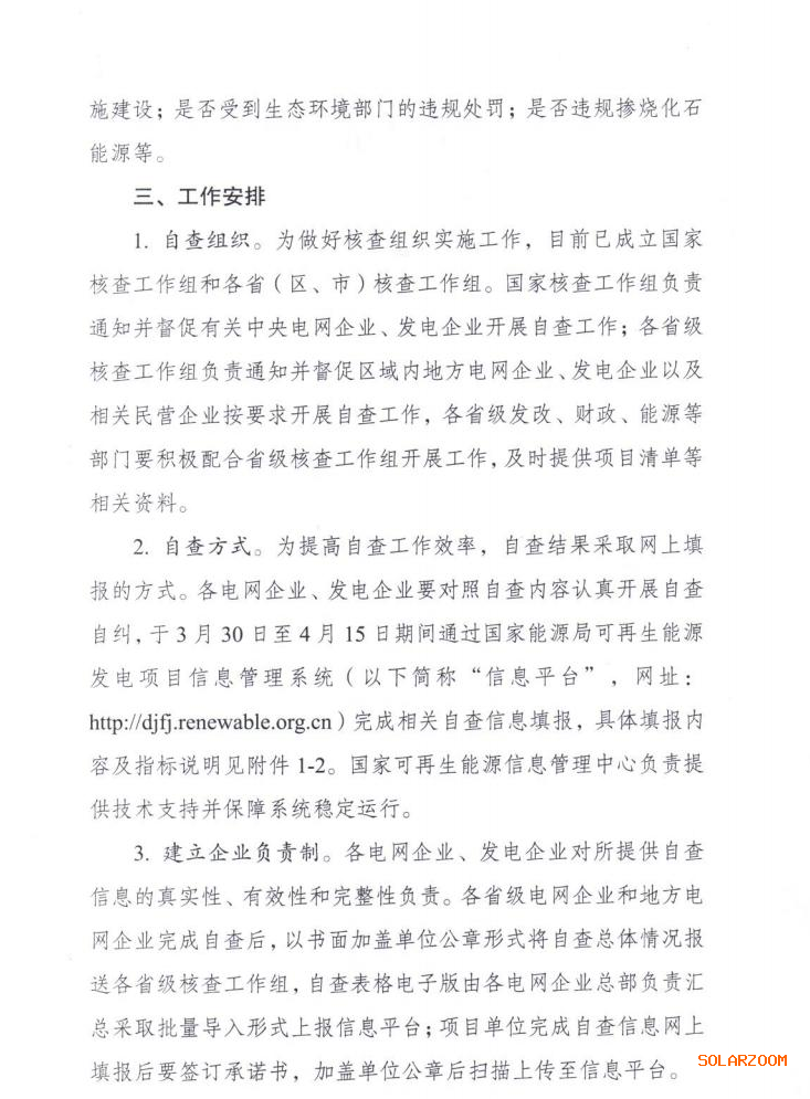 在具體自查組織方面,目前已經成立國家核查工作組和各省核查工作組,各省級發改委、財政、能源部門要積極配合核查工作。自查結果采取網上填報的方式,于3月30日至4月15日期間通過可再生能源發電項目信息管理平臺進行填報。電網企業和發電企業要對自查信息的真實性、有效性和完整性負責。