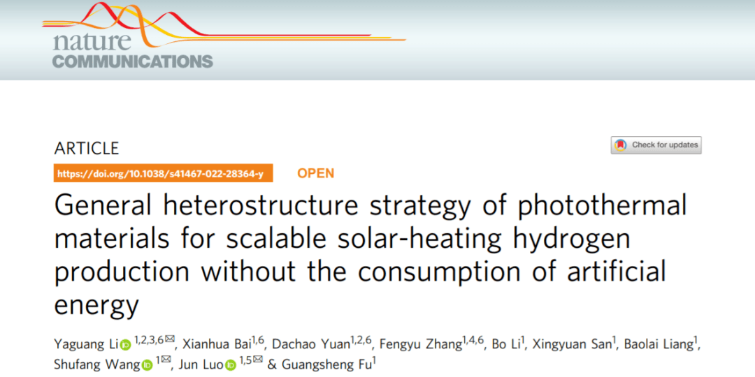 近日,相關論文以《光熱材料的通用異質結構策略用于可規模化的太陽能光熱制氫》(General heterostructure strategy of photothermal materials for scalable solar-heating hydrogen production without the consumption of artificial energy)為題,發表在Nature Communications上,李亞光擔任第一作者兼通訊作者。
