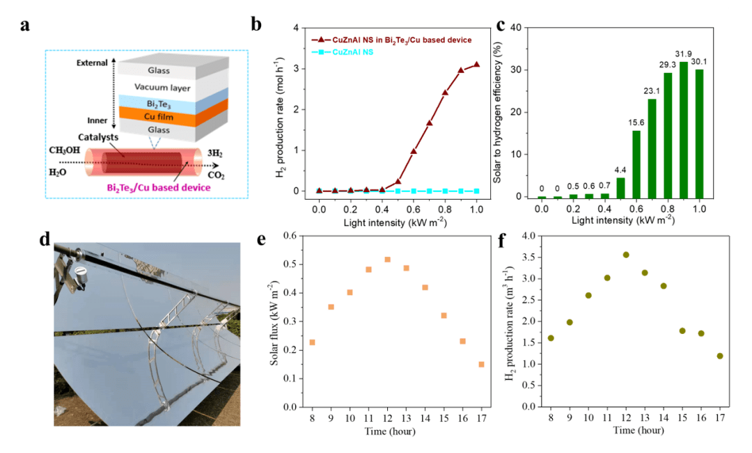 如前所述,為讓上述策略能用于光熱催化,李亞光將碲化鉍/銅異質結構制備成光熱系統,然后結合高效的甲醇重整催化劑,借此實現太陽光輻照下的甲醇重整制氫反應。