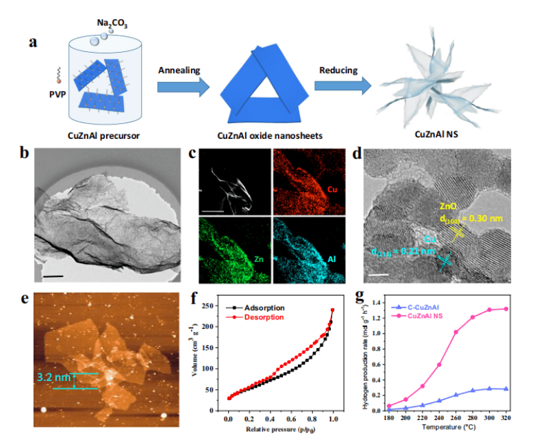 “該成果有潛力成為甲醇加氫站的綠色能源供給裝置,為新能源汽車提供氫氣。室外實驗結果顯示,6m2的太陽光輻照面積下,一天產氫量可達23.27m3,具有直接工業化應用的潛力。在一個標準太陽光輻照下,該系統能將CuZnAl二維催化劑加熱至305°C,甲醇重整制氫的速率高達310mmol g-1 h-1,太陽能-氫能轉換效率達30.1%,是目前文獻報道的光催化產氫效率的6倍。”河北大學物理學院研究員李亞光表示。