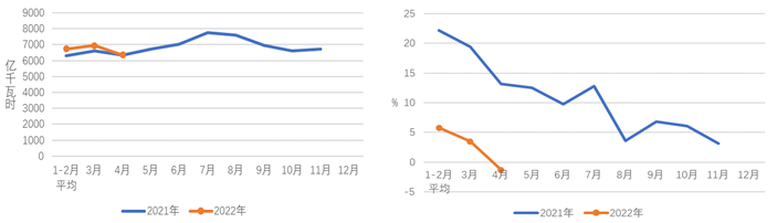 圖1 2021、2022年分月全社會用電量及其增速