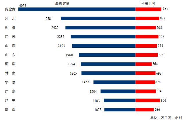 圖3 1-4月份風電裝機較多省份風電裝機容量和設備利用小時