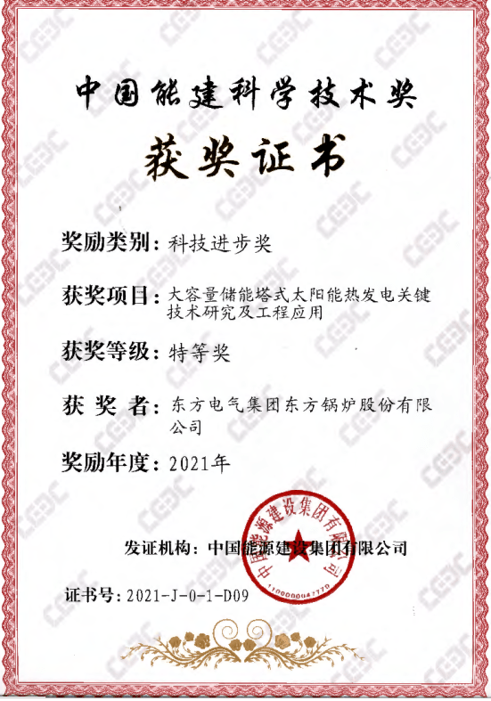 為促進能源行業科技進步,表彰東方鍋爐在太陽能光熱技術研究及工程應用中的突出貢獻,近日,中國能建集團向東方鍋爐頒發了“大容量儲能塔式太陽能熱發電關鍵技術研究及工程應用”科技進步特等獎證書,對東方鍋爐在該領域的支持表示感謝,為雙方后續開展更深層次合作,共同開發新興能源產業打下了良好基礎。