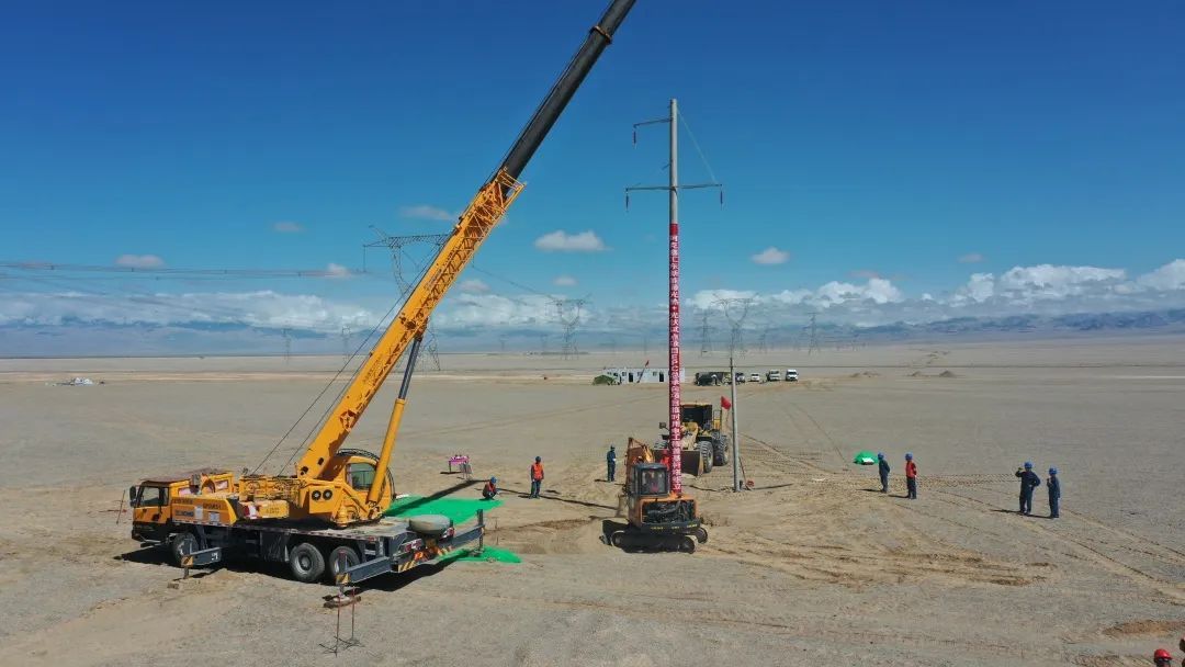 當天上午,在四十里戈壁項目建設現場,項目施工單位組織人員設備,對項目臨電塔桿進行了架設,在工作人員和機械的配合下,首根塔桿順利架設完成。