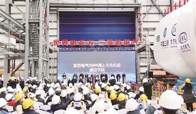 2022年2月22日,東方電氣集團自主研制的13兆瓦海上風電機組下線,該機組輪轂中心高度達130米,風輪掃風面積3.5萬平方米,在設計風速下,每轉動一圈可發電22.8度,單臺機組每年可輸出5000萬度清潔電能,能滿足25000個三口之家一年的正常用電,可減少燃煤消耗1.5萬噸、二氧化碳排放3.8萬噸,具有顯著的節能減排成效。