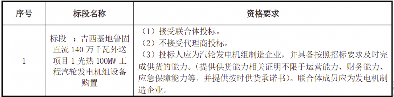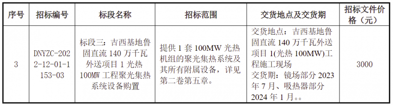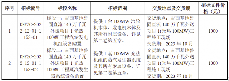12月23日,中國電能成套設備有限公司受國家電力投資集團有限公司委托,就吉電股份吉西基地魯固直流140萬千瓦外送項目100MW光熱工程汽輪發電機組、蒸汽發生器、聚光集熱系統發布招標公告。