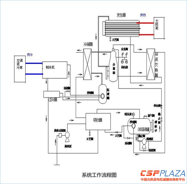 目前我們已經為一些學院等用戶設計、制造了23.2KW的太陽能制冷機組,機組以氨水吸收機組為制冷機組,利用平板太陽能、真空管、槽式太陽能提供的120度以上的蒸汽、熱水、導熱油為驅動能源,驅動機組制冷或做冰,其中氨水吸收制冷機組是我們的專利技術,系統的控制正在申報專利。從運行情況看,完全達到設計要求,滿足用戶的需要,下一步進一步完善,盡快實現市場銷售。