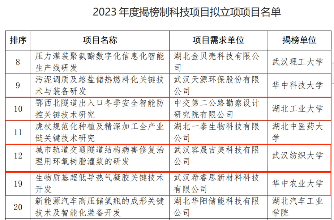 此次全省擬立項的47個項目中,我區入選的4個項目分別是武漢天源環保股份有限公司“污泥調質及熔鹽儲熱燃料化關鍵技術與裝備研發”、中交第二公路勘察設計研究院有限公司“鄂西北隧道出入口冬季安全智能防控關鍵技術研究”、武漢容晟吉美科技有限公司“城市軌道交通隧道結構病害修復治理用環氧樹脂灌漿的研發”以及武漢希睿思新材料科技有限公司“生物質基超低導熱氣凝膠關鍵技術開發”。目前四個項目已分別與華中科技大學、湖北工業大學、武漢紡織大學、華中農業大學等4家揭榜方達成共識并簽訂技術合同。