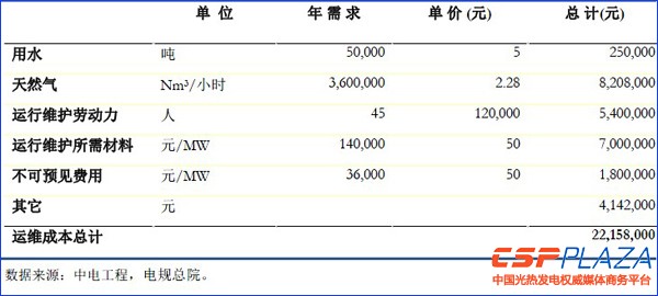 CCI結合歐洲同類電站的經驗,并結合了國內專家的專業建議,計算得出案例電站的運行維護成本估計為每年2216萬元人民幣,其中包括電站設備一年內正常情況下以及不可遇見的運行維護費用,比如反射鏡和吸熱管的更換、導熱油系統預熱所需天然氣的成本、電站保險費用、反射鏡面的清洗成本等。但該計算未計算廠用電的成本支出。如果廠用電從電網購得,參照內蒙古鄂爾多斯電價水平0.451元/千瓦時計算,每年用于廠用電的購電費用支出約為624萬元。